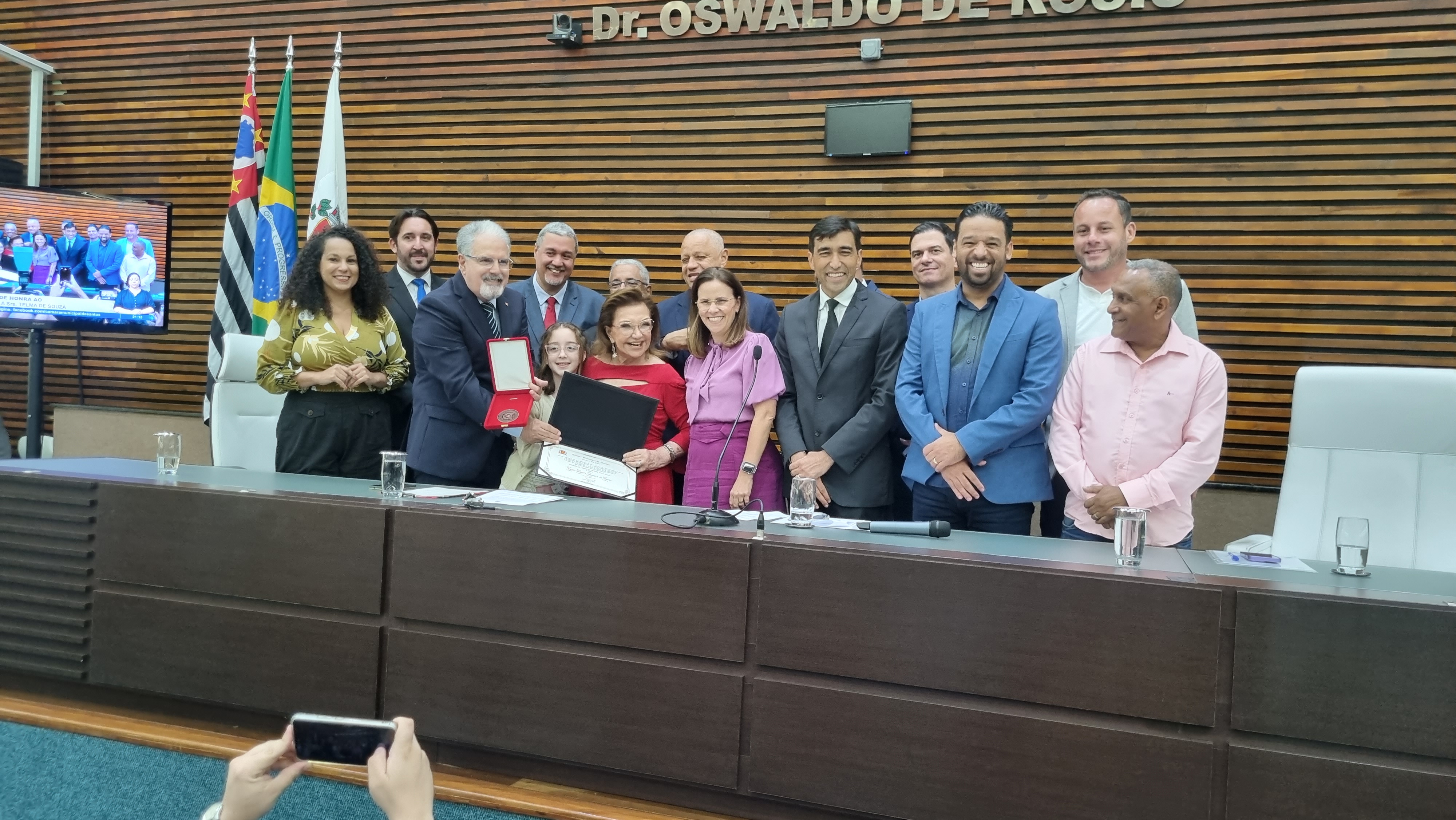 A vereadora Telma de Souza (PT) recebeu a Medalha Braz Cubas de Honra ao Mérito, a maior da Câmara de Santos, em sessão solene realizada no dia 29 de setembro (2023). Com isso, passou a ser a única pessoa a ter as três maiores honrarias da Cidade. Junto com a Braz Cubas, ela recebeu a Medalha José Bonifácio, concedida pelo Executivo em janeiro último, e já possuía o título de Cidadã Emérita.