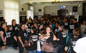 A deputada estadual eleita Telma de Souza (PT) comemorou junto com a população e militantes petistas a eleição da ex-ministra Dilma Rousseff à Presidência da República. Assim que foi anunciada a vitória de Dilma nas urnas eletrônicas, dezenas de militantes do Partido dos Trabalhadores reuniram-se no coração do Gonzaga. A comemoração contou com um abraço à Praça Independência. O ato foi realizado com uma forte carga simbólica em relação ao fato de o Brasil, com a derrota do PSDB, afastar o risco de ter o pré-sal vendido para empresas estrangeiras.