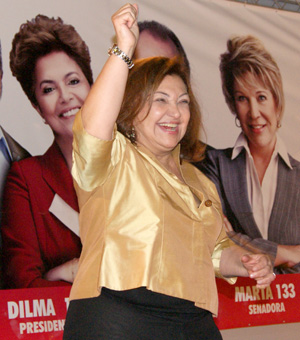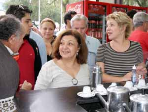 Um cortejo que reuniu centenas de militantes do PT acompanhou o encontro de três fortes estrelas femininas do partido, no início da tarde de hoje (27/9): Maria Lúcia Prandi, candidata a deputada federal, Marta Suplicy, candidato ao Senado, e Telma de Souza, candidata a deputada estadual.Depois de percorrerem diversas ruas do Centro Histórico de Santos, em apoio à candidata ao Senado, as líderes petistas fizeram uma breve parada no Café Carioca.
