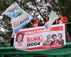 Em apoio à candidatura de Telma de Souza para deputada estadual, diversos militantes do Partido dos Trabalhadores (PT) realizaram na manhã desta terça-feira, dia 14, uma mobilização na principal avenida de Cubatão, a 9 de Abril. Com direito a som e telão e muitas bandeiras, foram distribuídos à população local santinhos e informativos sobre a atuação da parlamentar.