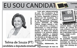 O jornal Diário do Litoral destacou em edição recente as propostas da candidata a deputada estadual, Telma de Souza (PT). Para a coluna Eu sou candidato, o periódico pediu um breve histórico e as propostas de ação. Para Telma, o uso do espaço jornalístico de forma democrática colabora com o esclarecimento da população e dá credibilidade ao veículo. Telma enviou o texto com propostas "Por um futuro à altura dos nossos sonhos" .