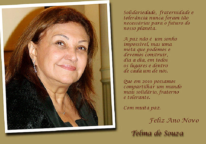 Solidariedade, fraternidade e tolerância nunca foram tão necessárias para o futuro do nosso planeta. A paz não é um sonho impossível, mas uma meta que podemos e devemos construir, dia a dia, em todos os lugares e dentro de cada um de nós. Que em 2010 possamos compartilhar um mundo mais solidário, fraterno e tolerante. Com muita paz.Feliz Ano Novo! Telma de Souza