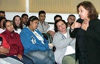 “Política se faz também com o coração”, disse na noite de segunda-feira (25), no Quarentenário, em São Vicente, a deputada federal Telma de Souza (PT-SP), após um dramático depoimento de uma aluna da Escola Profissionalizante Irmã Dolores. Telma, acompanhada da deputada estadual Maria Lúcia Prandi (PT), falou com os estudantes sobre Aids, programas sociais do Governo Lula e outros assuntos que foram levantados pelos alunos.
