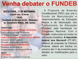 Leia maisA deputada federal Iara Bernardi (PT-SP), relatora na Câmara Federal da proposta de emenda constitucional (PEC) que cria o Fundo de Manutenção e Desenvolvimento da Educação Básica e de Valorização dos Profissionais da Educação (Fundeb), estará em Santos na próxima sexta-feira (11/11), para debater as modificações que estão sendo sugeridas na área do ensino. O encontro acontecerá a partir das 16 horas, na Faculdade de Serviço Social na Unisantos (Av. Conselheiro Nébias, 300). O evento está sendo organizado pelas parlamentares petistas deputada federal Telma de Souza, coordenadora da Frente Parlamentar em Defesa da Criança e do Adolescente da Câmara dos Deputados; deputada estadual Maria Lúcia Prandi, presidente da Comissão de Educação da Assembléia Legislativa de São Paulo, e vereadora Suely Morgado, presidente da Comissão de Direitos Humanos da Câmara de Santos.