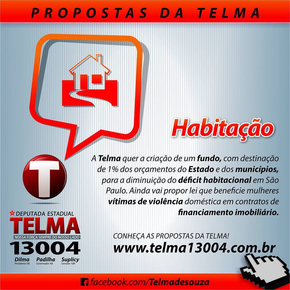 A Telma quer a criação de um fundo, com destinação de 1% dos orçamentos do Estado e dos municípios, para a diminuição do déficit habitacional em São Paulo. Ainda vai propor lei que beneficie mulheres vítimas de violência doméstica em contratos de financiamento imobiliário.