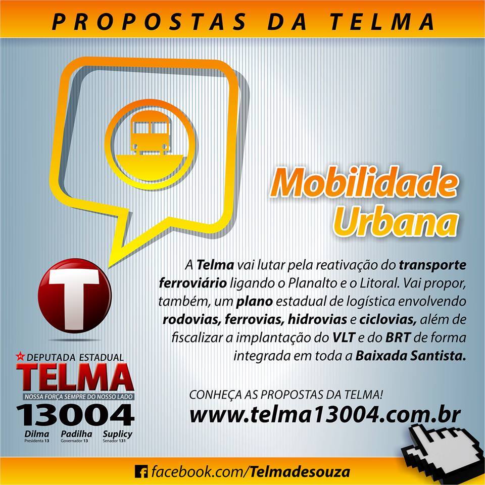 A Telma vai lutar pela reativação do transporte ferroviário ligando o Planalto e o Litoral. Vai propor, também, um plano estadual de logística envolvendo rodovias, ferrovias, hidrovias e ciclovias, além de fiscalizar a implantação do VLT e do BRT de forma integrada em toda a Baixada Santista.