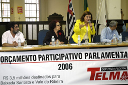 Leia mais“Seria muito mais simples e menos trabalhoso consultar pessoas conhecidas, ligadas a este ou aquele segmento, reunir seus pedidos e decidir para onde serão encaminhados os recursos federais. Entendo, porém, que a definição das emendas parlamentares não deve ser uma ação entre amigos ou de corte político, mas resultado de uma discussão mais ampla sobre onde esses recursos serão mais necessários e beneficiarão mais gente. Afinal, o dinheiro que o deputado e a deputada têm ao seu dispor, para elaborar as suas emendas individuais, é dinheiro público e, portanto, não deve ser direcionado de uma maneira discriminatória, política ou partidária.”Com essas palavras, a deputada federal Telma de Souza (PT-SP) explicou o objetivo da audiência pública realizada hoje (17/10), na Câmara de Santos, para decidir quais as emendas individuais que apresentará, nos próximos dias, ao Orçamento Geral da União para 2006. Entre as 15o pessoas presentes, estavam representantes de prefeituras, organizações não-governamentais e parlamentares da Baixada Santista e do Vale do Ribeira.