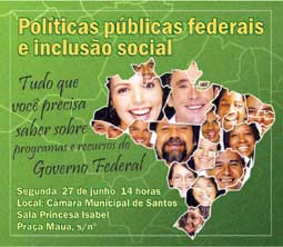 Leia maisTécnicos dos ministérios da Educação, Saúde, Desenvolvimento Social, Cultura, Esportes e Cidades estarão em Santos, na próxima segunda-feira (27/06), participando do seminário “Políticas Públicas Federais e Inclusão Social”. O evento, que acontecerá a partir das 14 horas, na Câmara Municipal (Sala Princesa Isabel), está sendo organizado pela deputada federal Telma de Souza (PT-SP) e tem, segundo a parlamentar, o objetivo de aproximar as políticas sociais do Governo Federal com prefeituras e entidades da Baixada Santista.