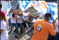 Leia maisUma apoiadora e um produtor de TV da campanha da candidata Telma de Souza receberam atendimento médico na manhã de hoje, após terem sido agredidos com socos, pontapés e golpes de cabos de bandeira por partidários do candidato João Paulo Tavares Papa (PMDB). O episódio ocorreu na avenida Antonio Emmerich, em São Vicente, cerca de meia hora antes do início do debate ao vivo entre os candidatos a prefeito de Santos, na sede da TV Brasil, afiliada do SBT. Ao tentar registrar a cena de um bate-boca, o cinegrafista Clebson da Silva Nascimento, da equipe de televisão da campanha de Telma, foi impedido por Ubirajara Hilário Chagas, apelidado de Bira, membro da campanha de Papa.