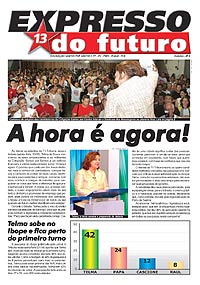 Leia maisO Expresso do Futuro, com a matéria do último debate da TV Tribuna, os números da mais recente pesquisa Ibope/TV Tribuna e a reportagem sobre a plenária final da campanha antes do primeiro turno, já está circulando. Com a manchete de primeira página "A hora é agora!", o jornal de campanha da Coligação Santos por Santos traz conclamação da candidata Telma de Souza para que os seus eleitores ajudem a buscar os votos necessários para a vitória no primeiro turno. Além destas, o Expresso explica por que é importante eleger os vereadores da Coligação e, em sua última página, fala de 13 bons motivos para eleger Telma prefeita. Procure seu exemplar nos comitês eleitorais da Coligação Santos por Santos