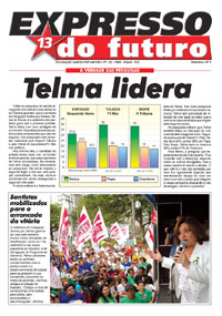 Leia maisJá está circulando a 5ª edição do Expresso do Futuro, jornal com as notícias da campanha da Coligação Santos por Santos, com Telma para prefeita e Pablo Greco para vice. Nesta edição, a liderança de Telma em todas as pesquisas de opinião divulgadas na última semana é o tema da manchete. É destacada também a arrancada de mobilização da Coligação Santos por Santos, com grandes atividades de rua, a partir do dia 7 de setembro. O Expresso do Futuro é distribuído em feiras e panfletagens e pode ser encontrado nos comitês eleitorais da Coligação.