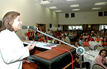 Mais de 600 mulheres evangélicas receberam calorosamente Telma de Souza para um chá da tarde nesta terça-feira, no Parque Balneário Hotel, numa grande manifestação de apoio à sua candidatura a prefeita de Santos. A presidente do Movimento Alfa de Ação Comunitária (MAAC) e do Movimento Feminino da Igreja Evangélica Assembléia de Deus em Santos, Eliane da Cruz Correa, disse que nos últimos dias teve a oportunidade de conhecer Telma "não apenas como uma lutadora e vencedora na política, mas também como uma mulher que tem coração e amor pela vida". Esposa do pastor Paulo Correa, Eliane lembrou as palavras bíblicas sobre a mulher virtuosa: "A mulher sábia edifica sua casa e a tola a derruba com as suas mãos".